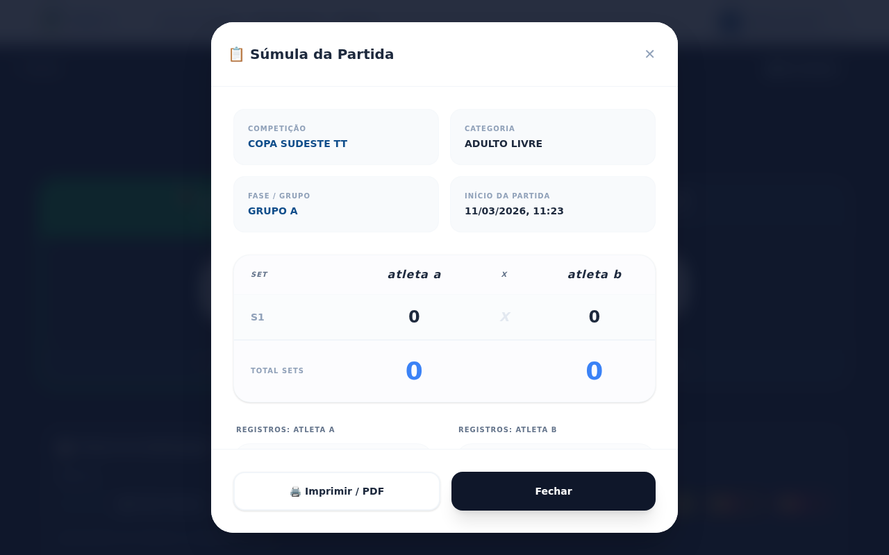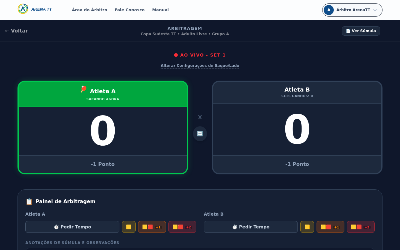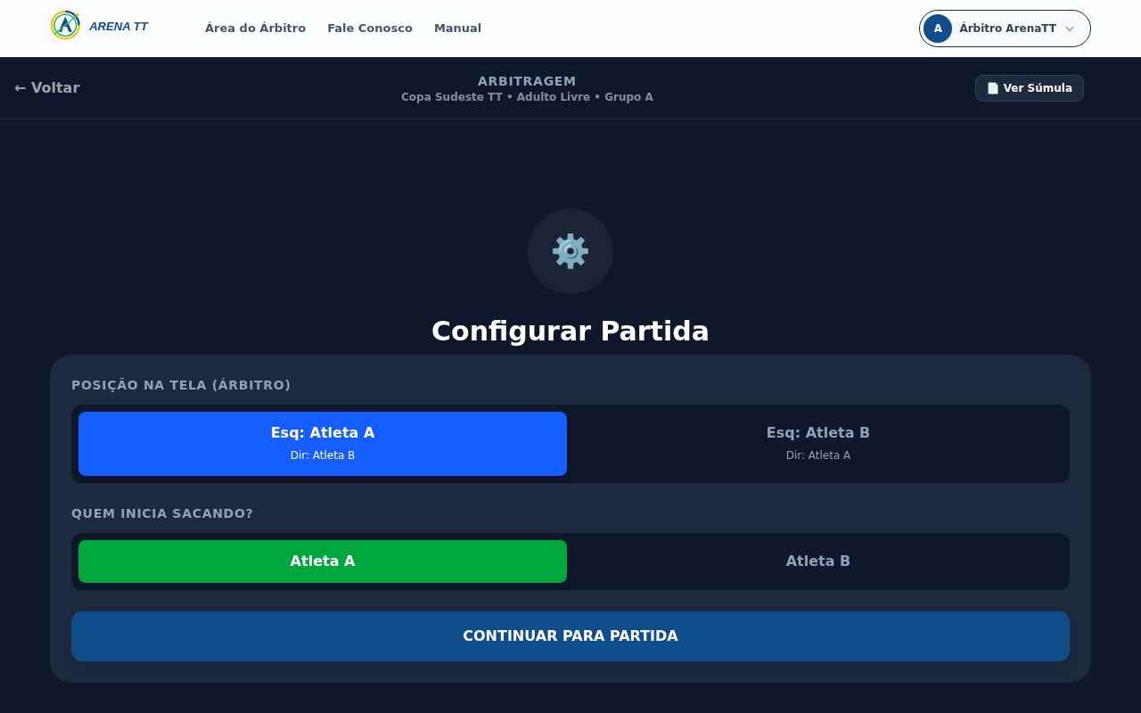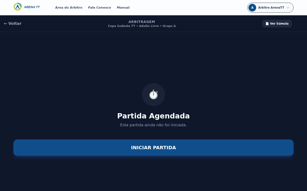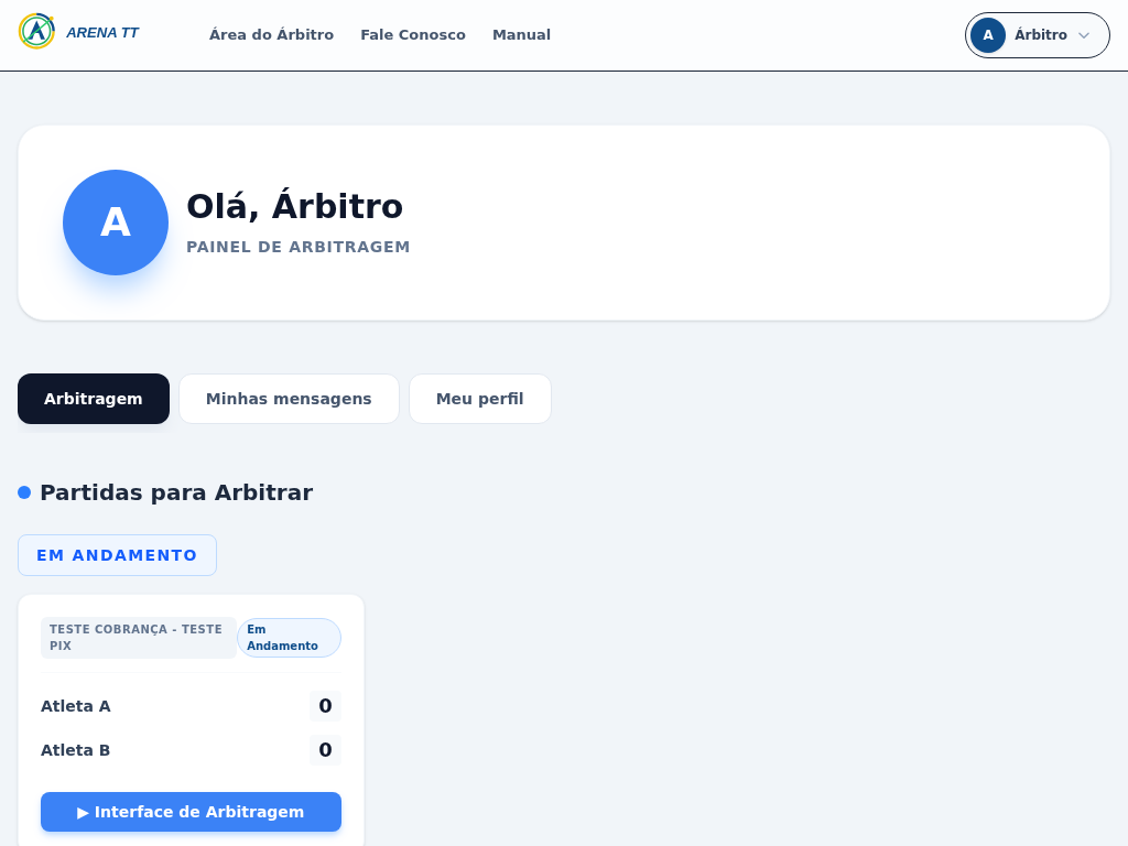 Caso você seja escalado para arbitrar alguma partida do torneio, ela aparecerá nesta aba. Você terá acesso à mesma interface profissional dos árbitros oficiais.